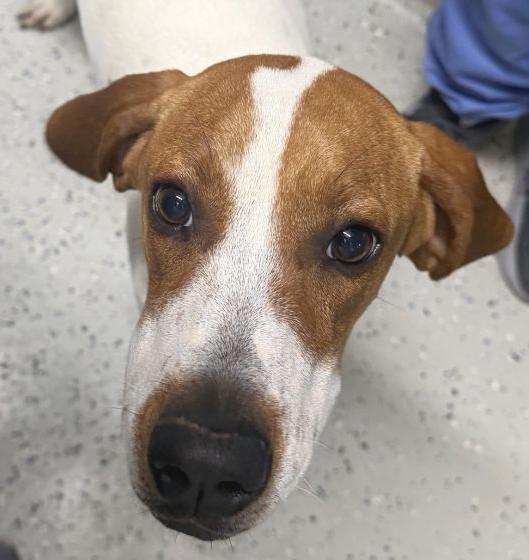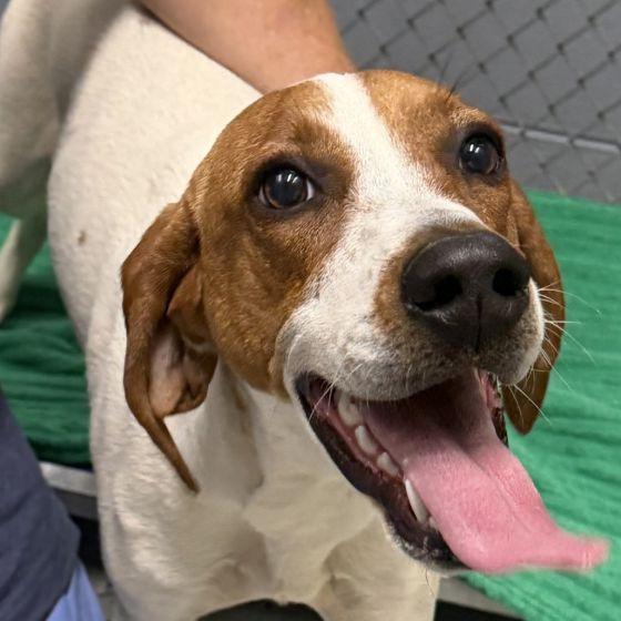 Pollyanna, Coonhound, Young, Female, Small, White Brown. Vaccinations up to date.This dog has been available for 8 days